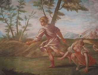 Strichzeichnung: Büste der Athena-Minerva, Relief über dem Hörsaaleingang des Hessischen Landesmuseums in Kassel von Christoph Nüsslein 1913/15. |